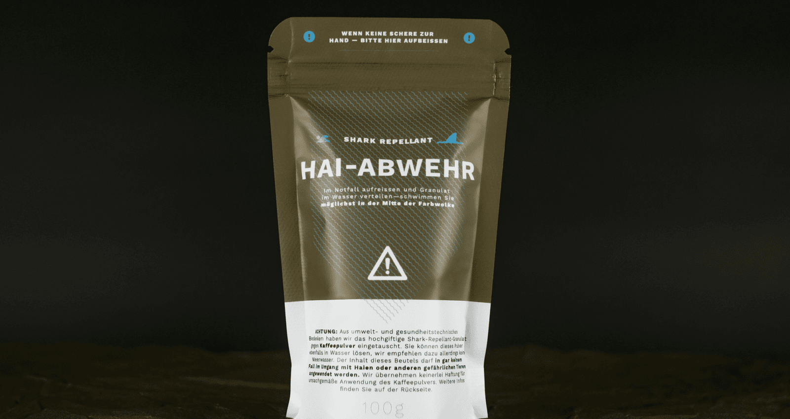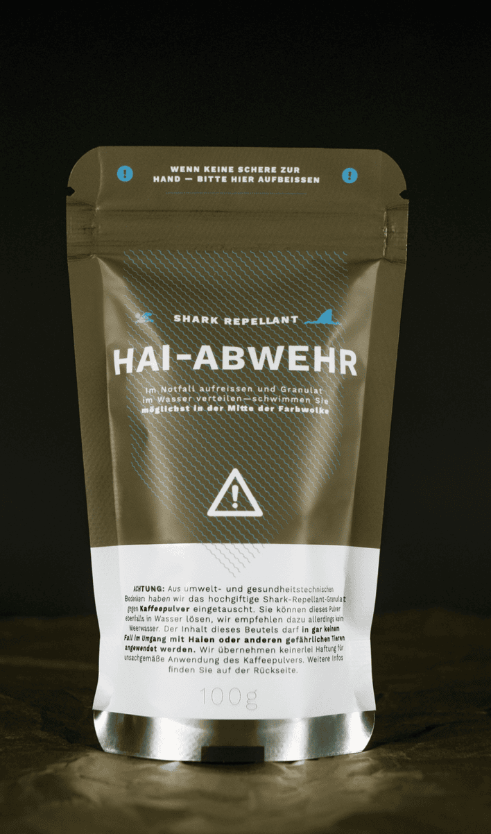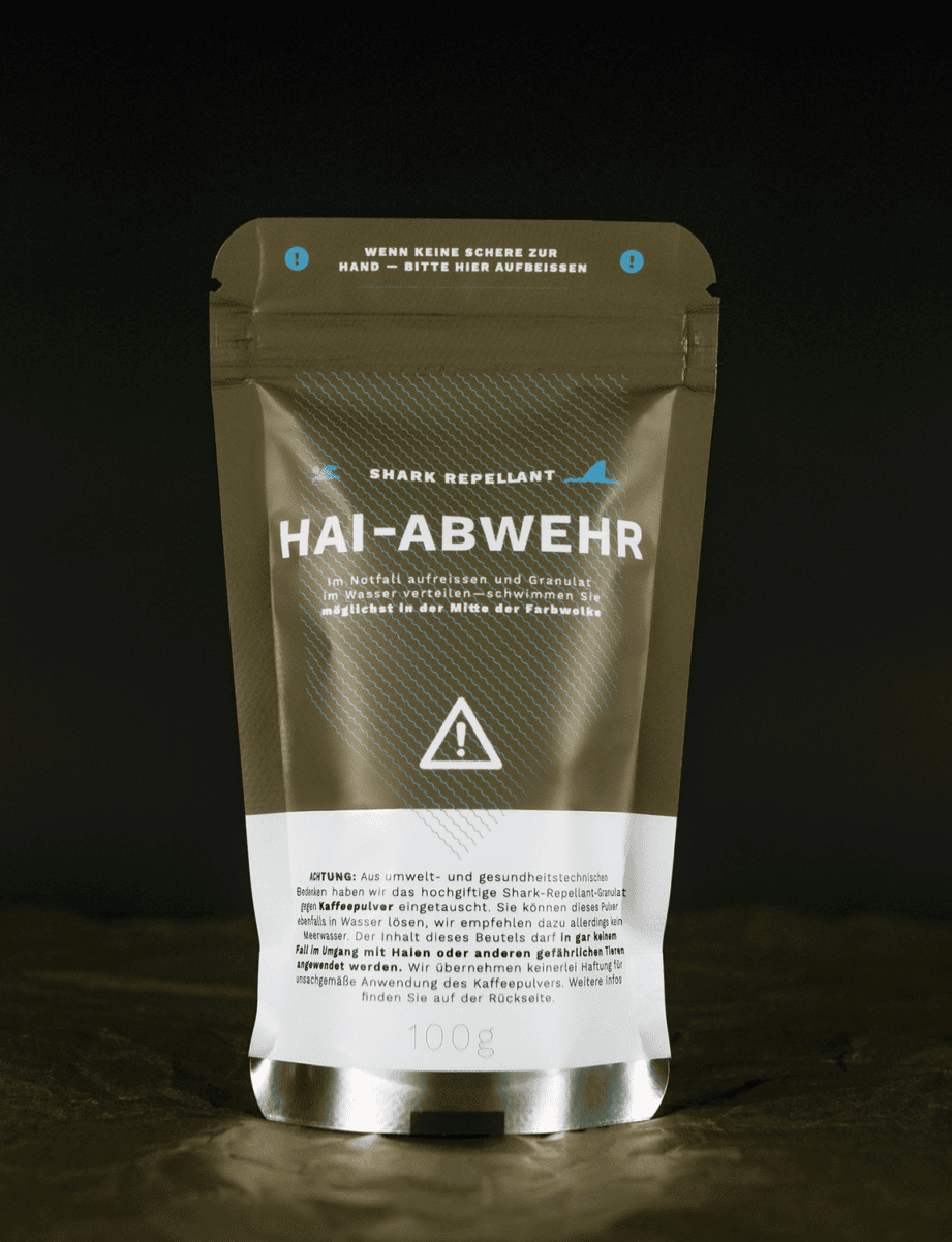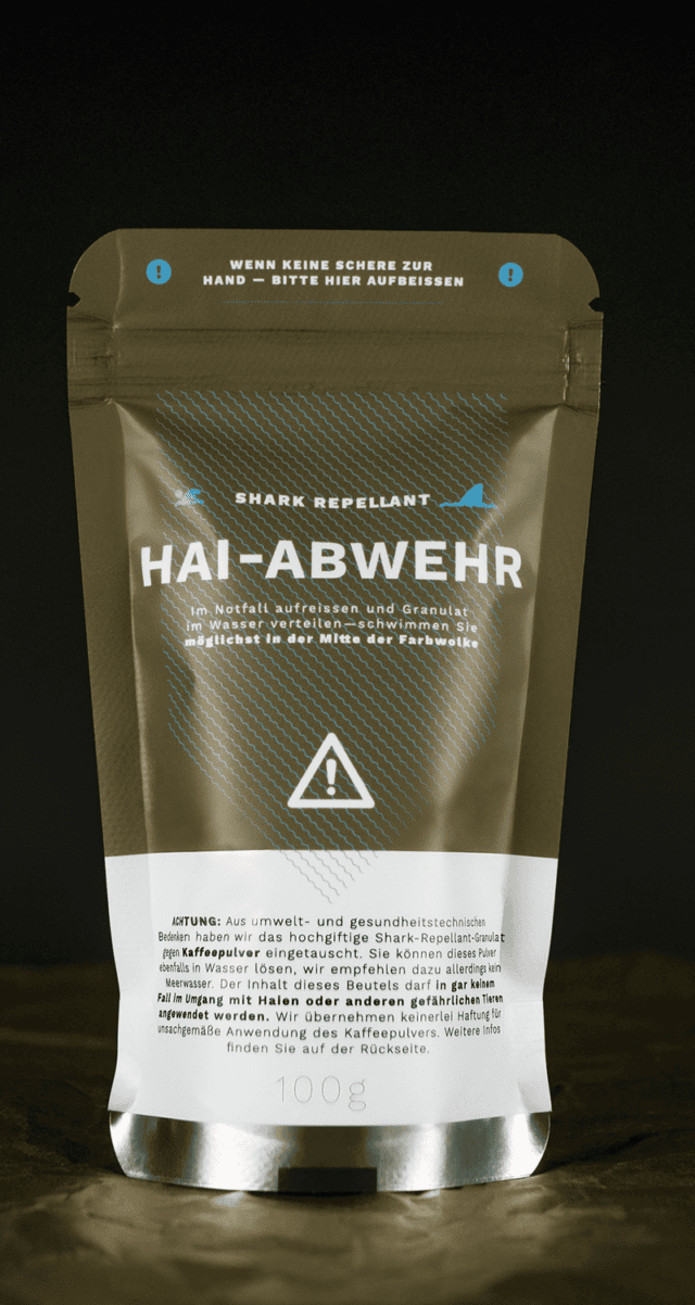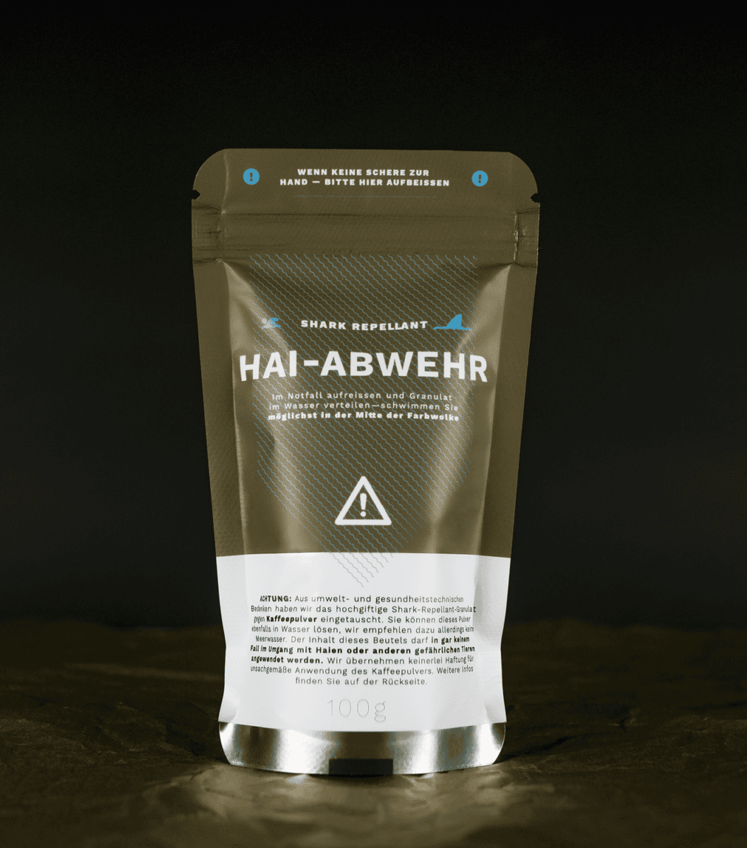 *Das Original Shark-Repellant ist ein hochtoxisches Gebräu, das NACHHALTIG der Umwelt schadet und zum Glück mittlerweile verboten wurde. Daher haben wir die Tüten nachgestellt und mit Kaffeepulver gefüllt. Trotzdem bitte nicht mit Meerwasser aufbrühen